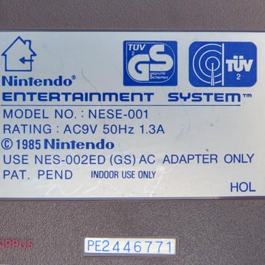 - Console Nintendo NES NESE 001 ©1985, en état de marche, 9 x 26 x 20,5 cm (1,3 kg). Traces d'un autocollant antérieur en haut à gauche.