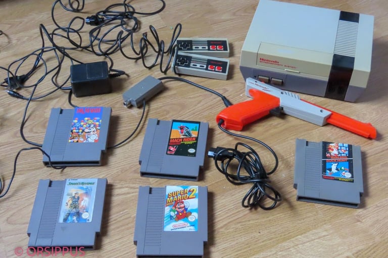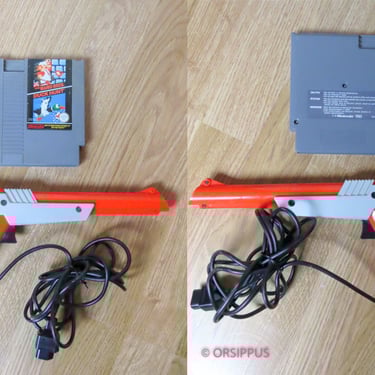 - Le Nintendo Zapper (pistolet) ©1985 : la gâchette fonctionne. Le pistolet ne peut détecter que la cible dirigée vers un tube cathodique. Cette dernière fonction n'a PAS été essayée avec un tube cathodique. 13,9 x 28,5 x 3,5 cm (300 g)